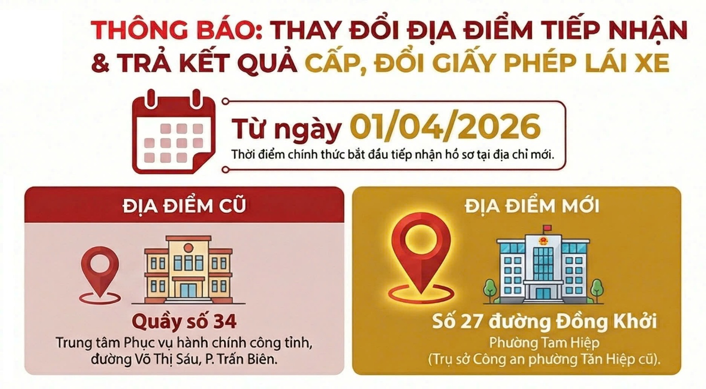 <p style="text-align:justify;">Từ ngày 01 tháng 4 năm 2026, Bộ phận tiếp nhận và trả kết quả giải quyết thủ tục hành chính trong lĩnh vực cấp, đổi Giấy phép lái xe (hình thức trực tiếp hoặc qua dịch vụ bưu chính) thuộc Phòng Cảnh sát giao thông Công an tỉnh Đồng Nai sẽ chuyển địa điểm làm việc.</p>